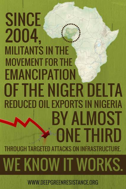 Small forces of ecological commandos could reverse this trend by targeting the fundamental sources of power that are destroying the planet. We have seen examples of this. In Nigeria, commando forces have been fighting a guerrilla war of sabotage against Shell Oil Corporation for decades. At times, they have reduced oil output by more than 60%.
